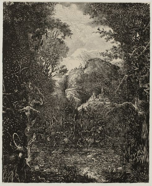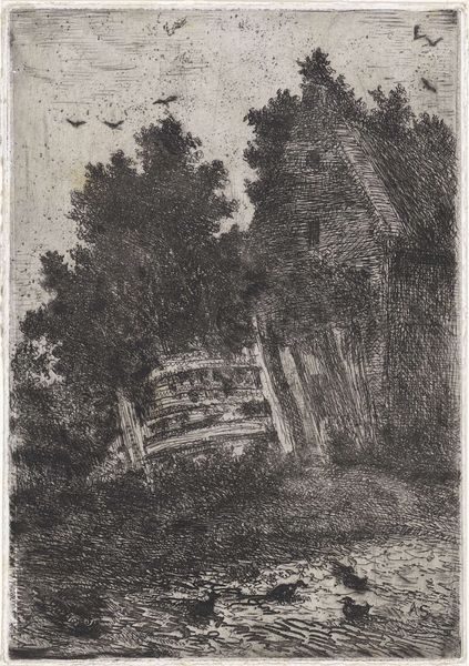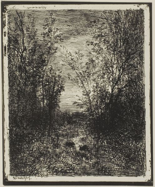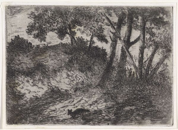 Arnoud Schaepkens created this etching, "Wanderer on a Path Along the Edge of the Forest" sometime in the 19th century. Schaepkens was part of a generation of artists who found inspiration in the natural world, often depicting quiet, contemplative scenes. This artwork is evocative of the period's shifting social landscape, particularly the rise of the middle class and an increased interest in leisure and nature. The lone wanderer invites us to reflect on our own relationship with the environment, and on the Romantic era ideals of individualism and personal experience. Notice how the dark, dense foliage contrasts with the open sky, creating a sense of mystery. The figure on the path appears to be caught between these two worlds, perhaps symbolizing the intersection between the known and the unknown. The bird in flight adds an element of freedom. In its delicate lines and nuanced use of light and shadow, the artwork emphasizes a sense of solitude and introspection, inviting us to consider the deeper connection between humanity and the natural world.