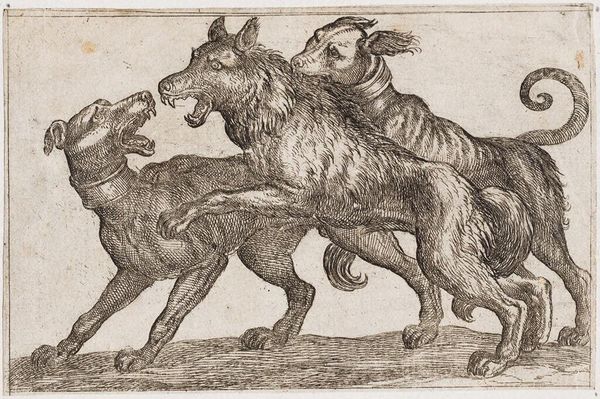 Curator: Antonio Tempesta, born in 1555, created this dynamic scene, "A Leopard Fighting a Boar." It's currently held at the Harvard Art Museums. Editor: What strikes me immediately is the raw energy. You can almost feel the tension in their muscles. I wonder about the printing process required to achieve such detail? Curator: Indeed, the intricacy of the engraving adds a layer of depth to the narrative. It is important to consider how the representation of animals, often stand-ins for human characteristics, was understood in Tempesta’s time. Power, aggression, vulnerability – all are on display here. Editor: And the level of labor involved! To translate the artist's vision into a reproducible image, the tools, the ink, the paper... It all speaks to a broader system of production and consumption of images. Curator: Precisely. And thinking about consumption, what did it mean to own such an image then? How did it contribute to a worldview shaped by power dynamics and nature's conflicts? Editor: Looking closely at the cross-hatching, I wonder what it means to see the raw labor in this sort of printed image. The materials and techniques reveal so much. Curator: Understanding the social and historical framework through which this artwork was created allows us to investigate its symbolic function. Editor: So much to consider! I'll certainly be thinking about the making of this print long after I leave.