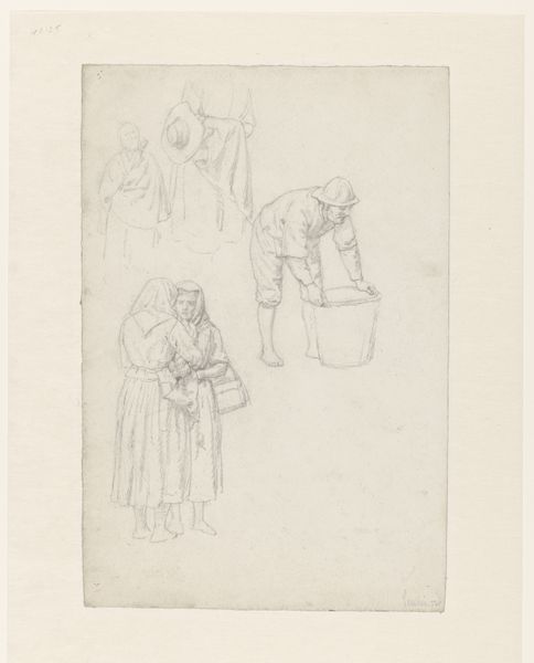 Curator: Welcome. Here we have Albert Küchler's 1823 pencil drawing, "Tegnende kunstner i et træ og figurrids"—which translates to "Drawing artist in a tree and figure sketches." Editor: My first impression is of ethereality; the soft pencil strokes create a dreamy atmosphere, almost as if these figures exist on the verge of disappearing. It’s hesitant, yet suggestive. Curator: The composition is quite striking. The primary figure, an artist sketching while perched within the branches of a tree, dominates the lower left. In the upper right are fainter studies. Küchler carefully positions the artist, using line and shadow to bring out form and suggest spatial depth. Note the intricate details in his clothing, contrasting the smooth texture of the page. Editor: Indeed. But what strikes me further is *who* has the luxury of idling up a tree sketching in 1823? It speaks of privilege, of a leisure class unburdened by labor, who can observe and represent the world without participating in its daily struggles. What is he seeing from that perch, and how does that shape his vision, removed as it is from those toiling below? Curator: The "view from above" provides perspective—literally. One could interpret this elevation as the Romantic idealization of the artist, a solitary figure mediating nature and its representation. His artistic gesture attempts to order and rationalize visual experience through formal elements, structure. Editor: It is, admittedly, exquisitely rendered—yet there's an insularity to this kind of scene. One cannot ignore the socioeconomic context and power dynamics it embodies, consciously or not. Who gets to be an artist is deeply interwoven with access and opportunity. Curator: I understand your points, of course. Yet within this drawing, beyond its implications, are sophisticated considerations of perspective, and texture achieved solely with variations in pencil pressure. It demonstrates masterful command of the medium. Editor: Art is always born into circumstance, however. Curator: True enough. Ultimately, the work resides both as artifact and as itself. Editor: And challenges us with both.