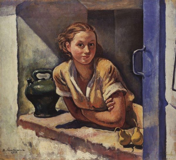 Editor: This is "The Daughter of a Fisherman" painted in 1936 by Kuzma Petrov-Vodkin, rendered in oil. There's a striking stillness about the girl; her gaze is so direct. What do you see in this piece? Curator: It's a fascinating intersection of personal portraiture and socio-political commentary. Consider the historical context: 1936, the height of Stalinism in the Soviet Union. While seemingly a simple portrait, it embodies complex dialogues surrounding identity, class, and gender in that era. Do you notice the window framing a traditional, almost idyllic seascape? Editor: Yes, the window and the sea create this beautiful backdrop. Curator: But the girl is not *in* that idyllic scene. She's separated from it, trapped in a liminal space. Consider also the term "fisherman’s daughter.” Fishing communities often represented a complex dynamic within Soviet society – tied to the land, yet often marginalized. What does it mean to portray her? Is it a celebration, a commentary on their social mobility, or something else entirely? Editor: It makes me wonder about her role in society and what opportunities were available to her compared to the seascape world. I assumed a simplicity that’s actually not there at all. Curator: Exactly! This portrait then becomes a potent exploration of social constructs and female identity. Her gaze challenges the viewer, forcing us to consider the realities beyond the romanticized surface. Do you think her clothing and accessories have something to tell? Editor: Absolutely. Her dress and jewelry appear fairly simple and they could suggest many things. This artwork encourages a critical understanding of art, moving beyond surface-level appreciation. Thanks! Curator: My pleasure! Seeing art as a reflection of broader societal narratives, with the capacity to foster inclusivity, is essential for understanding it.