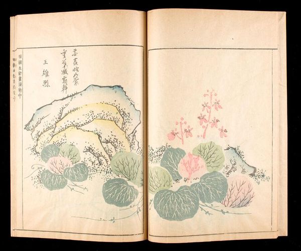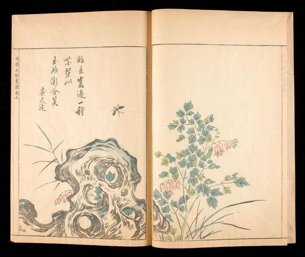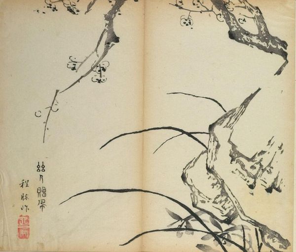Curator: This is an illustration called "Orchids and Rock" by Hu Zhengyan, who lived from 1584 to 1634. It comes from the Ten Bamboo Studio Manual of Calligraphy and Painting. Editor: It's stark, isn't it? The monochrome palette really emphasizes the textures, especially that rough rock. Curator: The manual was groundbreaking. It democratized art-making by providing models and techniques to a broader audience, shifting the power dynamics of artistic production. Editor: Exactly! And look at how the orchids, symbols of refinement, spring from such humble materials. It challenges the separation of art from everyday life. How was this manual consumed, I wonder? Curator: It was widely circulated, influencing generations of artists and artisans. It blurred the lines between professional and amateur, high art and craft. Editor: A beautiful example of how artistic expression can emerge from the most unexpected places. The artist's skill in manipulating ink and paper is evident. Curator: It reminds us that art isn't just about individual genius, but also about the social and material conditions that make it possible.