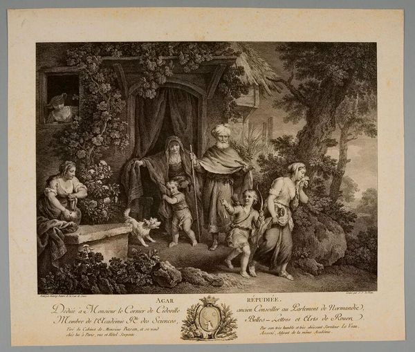 Editor: This is John Boydell's "The Finding of Cyrus." I find the contrast between the idyllic scene with the shepherds and the classical monument on the left quite striking. What symbols stand out to you in this print? Curator: Notice how the abandoned infant Cyrus is guarded by a dog, a symbol of loyalty and protection, near an ancient, perhaps pagan, altar. The shepherds, representing a simpler, pastoral life, are drawn toward a destiny they don't yet understand. The visual tension hints at the clash of cultures, doesn't it? Editor: It definitely does! I hadn't considered the shepherd's role as destiny. Curator: Consider too, how the image pulls from both classical and pastoral traditions to imbue the story of Cyrus with a sense of timelessness and universality. Editor: I will definitely keep that in mind. Thanks for sharing this interpretation with me. Curator: My pleasure. It is a reminder of how visual symbols shape and reshape our understanding of history.