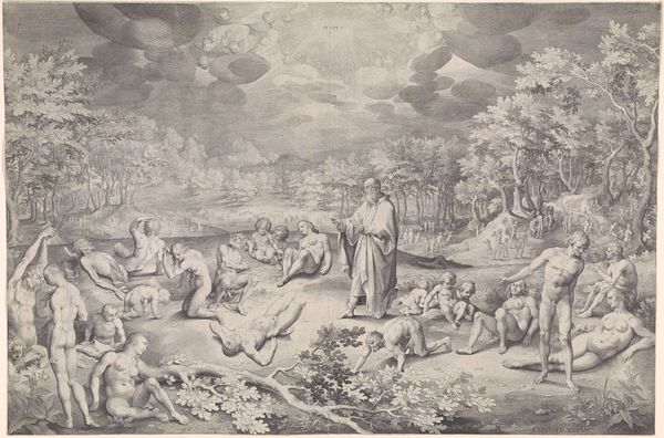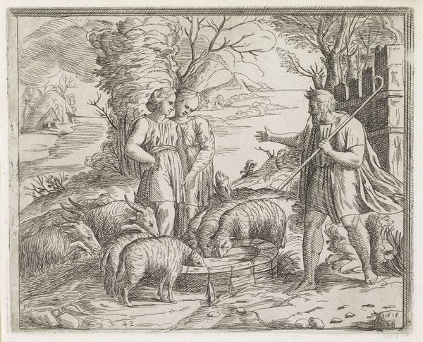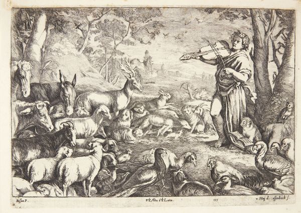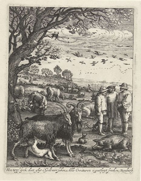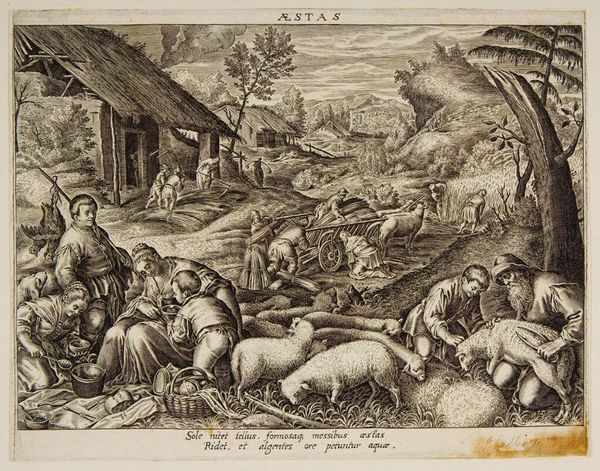 Curator: Look at this serene depiction of agrarian life. This is "Autumn" by Jan van Ossenbeeck, dating from around 1654 to 1660. It’s an etching, a type of printmaking common in the Dutch Golden Age. What do you see first? Editor: An intricate web of human figures amongst the sheep; there’s a starkness to the etched lines which creates an austere mood. Curator: Exactly, the starkness is the point. These etchings, with their detailed depiction of everyday labor, remind viewers of the seasonal rhythms that governed life. We are drawn to the continuous activity; everyone plays a necessary part. Observe the compositional balance, how the eye moves from the foreground activities to the distant hills. The home is set against an ever active topography. Editor: It's almost a utopian vision, everyone working interdependently on this hillside—yet there’s labor being distributed among all ages and sexes. It raises questions for me about social structures, and, as it seems rather romanticized, who exactly it’s for. Was Ossenbeeck making a claim for or against a social hierarchy, presenting a clear vision of its role in a healthy community? Curator: A point well taken, its possible a utopian representation is present to make exactly those points about hierarchy in relation to societal harmony. The use of symbolic imagery here adds weight. See the prominence of family and livestock? Both represent cyclical sustenance, both physical and generational. Look at the background, what you can see are what are considered the riches of life. Editor: It's a powerful statement of community interdependence and an implicit environmental consciousness that seems remarkably poignant today, reminding us of simpler relationships that perhaps did exist in the world at that time. Curator: I agree; in seeing these symbols, we also feel a powerful draw. We also begin to feel for a vision for a culture and people. What will you take away from this time with Van Ossenbeeck’s etching? Editor: Its an ode to collective social consciousness as well as perhaps collective environmental consciousness that I find valuable to ponder over. Curator: I’m most affected by the potent cycle of symbology throughout; seeing a unified, symbolic relationship between our generations that this depiction captures so beautifully.
