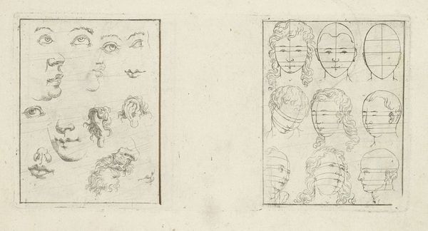 Editor: Here we have "Verschillende dameskapsels en hoofddeksels," or "Different Ladies' Hairstyles and Headwear," an etching by Daniel Nikolaus Chodowiecki from 1779. The detail is quite intricate. What strikes me is how much these images convey about the materials and labor involved in these styles, despite their small scale. What do you see in this piece? Curator: Indeed. The labor is key here. Look closely at the etching. The painstaking detail rendered in each line signifies hours, potentially days, of work. Consider not just the artist's labor, but also the labor embedded within the represented hairstyles themselves. Who constructed these elaborate coiffures? What materials were used: human hair, animal hair, wire, padding, and how were those obtained, prepared, and ultimately consumed by fashionable society? This image isn't just about aesthetics; it's about the means of production of status. Editor: That’s fascinating! I hadn’t really thought about it in terms of production. So, the print is not just showing the styles, but also hinting at this whole system of labour… Curator: Exactly. Chodowiecki gives us a peek behind the scenes, at the material reality underpinning elite visual culture. This piece prompts us to question the hierarchies between ‘high art’ like history painting—of which Chodowiecki made prints—and what we might typically consider ‘craft,’ like hairdressing. Editor: That's a powerful point. So much goes into what appears, on the surface, to be mere fashion. I’ll never look at 18th-century portraiture the same way again. Curator: And hopefully, we'll all be more attuned to the labor and materials behind what we consume every day. This image challenges us to rethink what we value.
