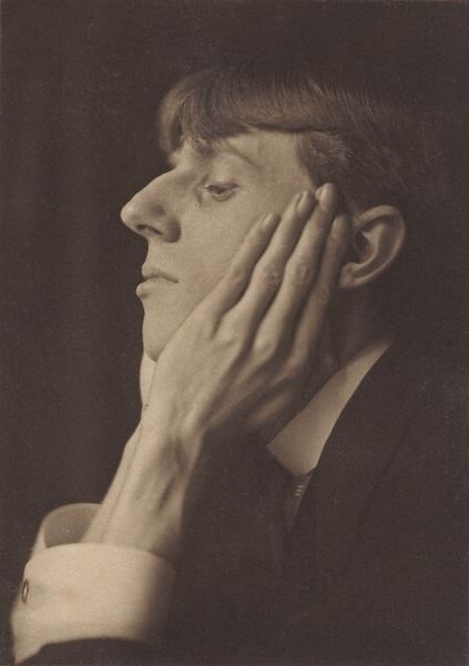 Curator: This is Alvin Langdon Coburn’s "Self-Portrait" from 1905, a photograph that exemplifies the Pictorialist style. Editor: It's immediately striking, isn't it? The heavy shadow, the slightly downward glance... There's an undeniable air of melancholic defiance. The texture of his clothing is remarkably visible too, quite impressive. Curator: Absolutely. Coburn was a key figure in the Pictorialist movement, which sought to elevate photography to the status of fine art through soft focus, evocative compositions, and hand-manipulated printing techniques. Consider the social context; photographers at this time fought hard for artistic recognition. Editor: Yes, I'm fascinated by the materiality of these early photographs. The paper stock, the chemical processes—they’re so critical. Looking closely, I see the subtle graininess, the tonality achieved through platinum printing, I think. Curator: Indeed, the process is critical to the image’s success. And I find Coburn's gender performance interesting. The loosened cravat, the slightly disheveled hair - it defies traditional expectations. Editor: Well, the details reveal a world of craft. From tailoring to the photographer's manipulations in the darkroom, labor is really brought into the fold. Curator: By playing with light and shadow, Coburn crafts a complex character. It allows a contemporary reading about self-representation, about the power dynamics embedded in portraiture and the questioning of societal roles. He isn’t merely documenting himself. Editor: And considering how many photographic processes he mastered, it’s clear Coburn wanted photography accepted not just as a document, but as crafted object with immense aesthetic potential. The sheer labor investment challenges conventional artistic hierarchies. Curator: His willingness to engage with alternative printing processes pushed the boundaries. Coburn’s portrait offers layers, isn't it? He acknowledges tradition, but simultaneously seeks to transcend its limits, both in artistic and societal conventions. Editor: It's a testament to the transformative potential held within photographic materials themselves. Really thought-provoking. Curator: An important consideration when assessing this pivotal moment. Editor: Definitely! Thanks for bringing this work to life!