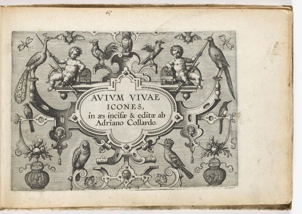 Editor: This engraving, “Titelprent voor een serie met jachtscènes” by Egbert Jansz., dates back to 1598. The pen strokes create a very formal, almost ceremonial scene, though the dogs add a touch of liveliness. What symbolic significance do you see in the recurring imagery? Curator: The symbols resonate deeply within the historical context of hunting. Notice how the print stages a juxtaposition of human control and nature’s bounty. The presence of Diana, the Roman goddess of the hunt, reminds us of classical ideals. The hunting implements - crossbows and spears - represent human agency and power. What emotions are evoked when you consider these symbols alongside the text “Nova recens inventa”? Editor: That it's something recently innovated or discovered. But that makes me think about how traditions evolve. Is there any tension here between innovation and the well-established traditions of the hunt? Curator: Exactly! The tension is palpable. Innovation is ever-present. Look at the faces: The determined hunter with his falcon versus the playful dogs below. One highlights established practice; the others a potential departure. Ask yourself, what does hunting *mean* to society? Editor: It’s more than just sport or sustenance. The symbols imply it reflects social status and historical memory. I see how the images convey complex cultural ideas about humanity's place in nature, power, and legacy. Curator: Precisely. Symbols layer our understanding. This piece really emphasizes how potent a blend of text and imagery can be in capturing these cultural anxieties.