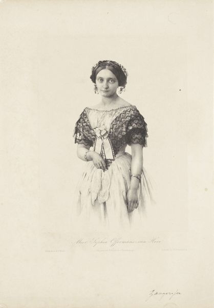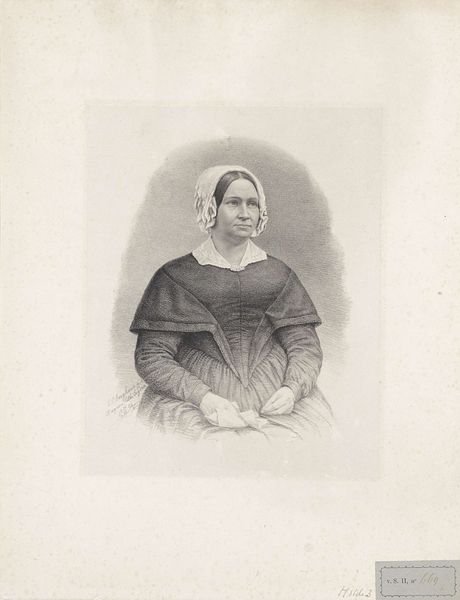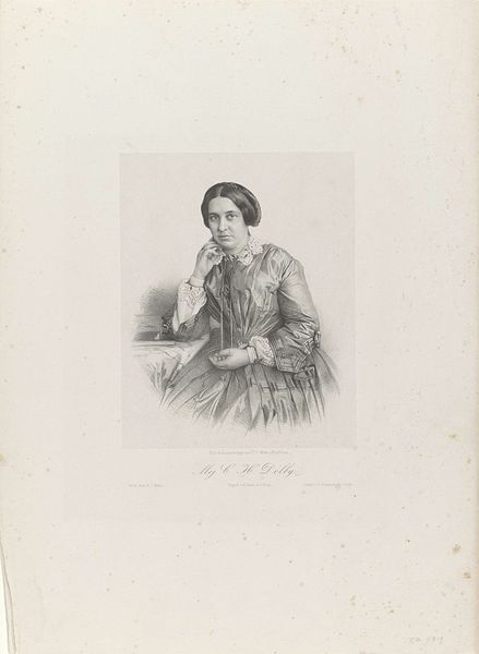 Adrianus Johannes Ehnle created this portrait of Sophia Offermans-van Hove in 1854. Notice how Ehnle plays with the monochrome medium to achieve a captivating range of light and shadow. The composition is structured around the sitter's pose. The slight tilt of her head, the delicate placement of her hand against her face, and the gentle curve of her dress create a flowing, almost musical rhythm across the image. The lines are soft, and this lends a certain grace to the sitter. Consider also the texture. Ehnle uses hatching and stippling to mimic the tactile qualities of fabric, hair, and skin. The interplay of these textures enriches the visual experience, drawing our eye to the fine details of the sitter's attire and features. Ultimately, this portrait engages with notions of beauty, class, and representation in the 19th century. It prompts us to reflect on how artists use formal elements to construct and convey meaning.