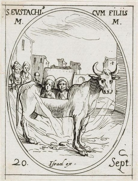Curator: This is Jacques Callot's "Saint Julian," a small etching housed here at Harvard Art Museums. Editor: It feels oddly dreamlike, this little scene. Almost a mirage, with those spindly figures and the improbable camel. Curator: Callot, born in 1592, was a master of etching, and this work exemplifies his detailed technique. Notice the cross-hatching to build tone and form. Editor: The whole composition feels so light, almost ethereal. Like a half-remembered saint's day parade. Curator: Indeed. The social context of printmaking at the time allowed for wider distribution of such imagery, influencing popular devotion. Editor: It makes you wonder about the hands that held this tiny print, the stories they told around it. Curator: A testament to the power of the reproducible image, wouldn't you say? Editor: Absolutely, and to the enduring magic held within these delicate lines.