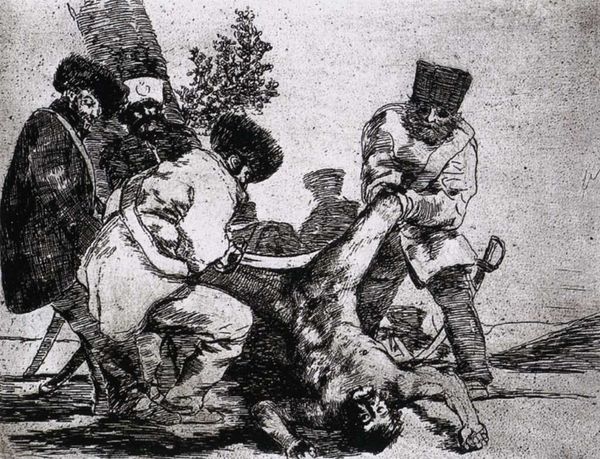 Francisco Goya created this etching, titled "The Same," as part of his series "The Disasters of War," likely between 1810 and 1820. It captures a scene of brutal violence, a pile of bodies beneath a man wielding an axe. Goya was working in Spain during a period of intense political upheaval. The Peninsular War, with its widespread violence and social disruption, deeply affected him. This print isn't just a depiction of violence; it's a commentary on the dehumanizing effects of conflict. The figures are anonymous, stripped of individuality, emphasizing the generalized suffering of war. Goya's work questioned the institutions of power. His unflinching portrayal of violence challenged the romanticized visions of war promoted by the state. To understand Goya's work fully, scholars consult historical records, personal correspondence, and studies of Spanish society during the Napoleonic era. This helps us to understand how art reflects and responds to specific social and institutional contexts.