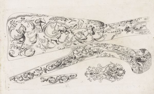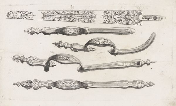 Curator: Let's examine this intriguing drawing, “Kolf en schroefplaten,” which roughly translates to “Golf and Screw Plates." Created by an anonymous artist sometime between 1690 and 1725, it resides here at the Rijksmuseum. The piece is a pen sketch and engraving on metal. Editor: My initial gut feeling? This is baroque detail cranked up to eleven. A fantastical marriage of weaponry and ornate scrollwork that feels almost comical, in its extravagance. I feel a mischievous energy emanating from these images of military glory and playful ornament. What a visual paradox! Curator: Indeed. The work displays a classical Baroque sensibility, characterized by dynamism and elaborate embellishment. The composition follows a somewhat linear structure but contains highly complex iconography and ornamentation; we see the meticulous line work, a hallmark of engraving techniques of the era, defining each form with precision. Editor: Precision's a good word! The more you look, the more these vignettes tell some kind of layered story about conquest, perhaps mixed with playful decadence. A narrative dance of power! Like each flourish hides a wink, or a snide remark. How amazing it would be to decipher its messages completely. Curator: Deciphering requires consideration of symbolic vocabulary common during this period, when detailed design communicated one’s power or sophistication through elaborate allegory. Note how the drawing blends visual objects related to weaponry, hinting at militaristic endeavors intertwined with lavish lifestyles. Such drawings often served as design templates for artisans specializing in metalwork embellishments. Editor: I keep returning to this whimsical vibe it exudes. I sense it poking fun at self-importance, like visual poetry dressed as battlefield fanfare. Perhaps the anonymous artist wanted us to both marvel at and question such ornate declarations. Curator: That is insightful. While my approach stays analytical, interpreting through design principles and historical motifs, I acknowledge how pieces spark emotional engagement too! That subjectivity adds a layer that completes any work, wouldn't you say? Editor: I would, yes! These images echo and complicate human foibles, and provoke deep thought! That alone renders the artist victorious even today!