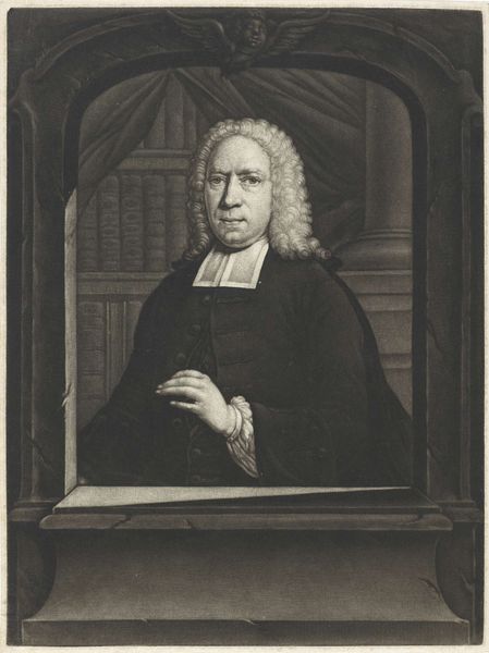 Editor: Here we have Joseph Badger's portrait of George Whitefield, created sometime in the mid-18th century. The dark tones and simple composition give it a very serious feel. How do you interpret this work? Curator: Badger presents Whitefield, the famous evangelist, in a way that emphasizes authority and piety, reflecting the social and religious values of the time. Notice the book, likely a Bible, and his hand gesture. They were carefully chosen to project an image of devoutness and intellectual rigor. Editor: So, it's less about individual personality and more about conveying a specific message to the public? Curator: Exactly. These portraits served a purpose, shaping Whitefield’s image and reinforcing his influence in a society deeply engaged with religious and moral questions. Editor: That makes me think about how images are still used today to build up public figures. Curator: Indeed, understanding this context can help us see how art plays a role in shaping society's perceptions, even today.