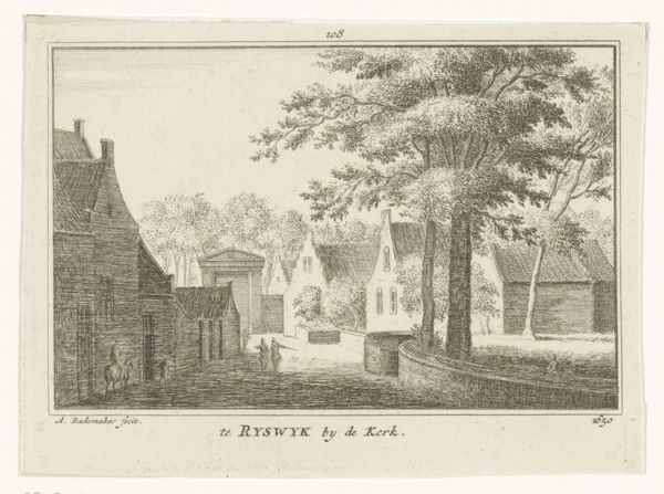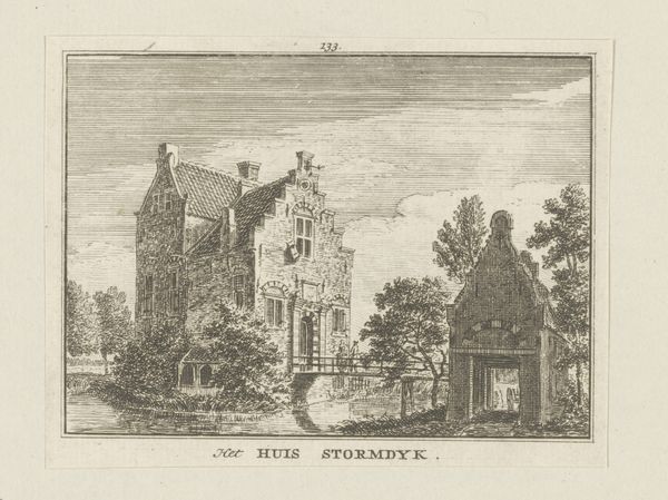 Hendrik Spilman created this etching titled "Gezicht op het Hof van Rijnsburg" in 1730. It’s a landscape where the interplay of light and shadow immediately draws the eye. The architecture is rendered with incredible precision, emphasizing the geometric forms of the buildings against the organic shapes of the trees and clouds. Spilman uses a dense network of fine lines to create tonal variations that give depth and texture to the scene. This technique invites us to consider the relationship between representation and reality. How does Spilman's structured depiction of the landscape reflect the ordered worldview of the Enlightenment? The etching uses a semiotic system of signs, with classical architectural motifs suggesting ideas of order and permanence while the decaying state of parts of the buildings introduces a counter-narrative of change and impermanence. The structured composition and detailed execution invites us to consider how the artwork destabilizes established meanings, and how the artist used line, color, composition and scale.