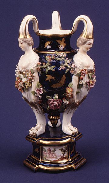 This porcelain incense burner was made by the Derby Porcelain Manufactory between 1751 and 1785, a period marked by the height of the Rococo movement. The piece presents a fascinating confluence of wealth, ritual, and the natural world. Its cobalt blue glaze, embellished with gilded floral patterns, speaks to the opulence sought by the aristocratic consumers of the time. Yet it's the incorporation of the natural world via the goat heads that compels us to consider broader questions about the relationship between humans and animals. Goats, often associated with virility and untamed nature, are here tamed and transformed into decorative elements. This tension evokes the era's complex negotiations between Enlightenment rationalism and the raw, emotional aspects of the human experience. The incense burner invites us to meditate on how objects, even those meant for personal ritual, reflect cultural values and power dynamics.