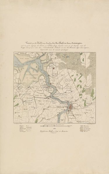 Editor: Here we have "Kaart van de Schelde met de posities van de Nederlandse oorlogsschepen, 1831," created in 1832. It’s attributed to Willem Cornelis van Baarsel. Looking at it, I immediately get a sense of… deliberate precision, like someone planning a very important game. It's all in watercolor and ink. How do you interpret this work? Curator: A map is never just a map, is it? It’s a coded story. Notice how the positions of the Dutch warships are meticulously noted, and consider the psychological weight that such a precise rendering carries. This isn’t just about navigation; it’s about power, control, and the strategic visualization of dominance. How does the rendering of Antwerp itself strike you, given its bright coloration? Editor: Antwerp seems so…contained, almost aggressively so with that heavy outline. The red makes it look less like a city and more like a military target. Curator: Precisely. Color amplifies the symbolic intention here. Red, culturally, often represents conflict, blood, urgency. Its placement speaks volumes about the perceived vulnerability and strategic importance of Antwerp in the context of these naval deployments. Do you think the detail given to the surrounding areas is also trying to say something? Editor: Maybe… there's a stark contrast, with those areas appearing much calmer, more agrarian. Almost as if to say, "Here is what we are defending." So the image functions beyond just documenting geography – it's presenting a particular narrative, loaded with strategic and even emotional intent. Curator: Exactly. Each mark, each color choice contributes to a larger, deliberately constructed message of national strength and territorial claim. The map becomes a visual assertion of Dutch maritime power, carefully crafted to influence perception, both internally and externally. Editor: That reframes my whole perspective. It’s fascinating to see how symbols work on so many levels. Curator: Indeed. The emotional, the strategic, the territorial – they're all interwoven. Understanding this allows us to decipher the rich cultural code embedded within even seemingly straightforward cartography.