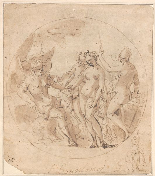 Curator: Immediately striking, isn't it? The sheer, raw emotion captured in such sparse lines. Editor: Indeed. The piece before us, attributed to Giuseppe Cesari and dating approximately from 1568 to 1640, depicts "The Fall of Man." The medium here is pen and the artwork now resides at the SMK, the Statens Museum for Kunst. What are your immediate observations regarding Cesari’s treatment? Curator: The composition, first. The figures of Adam and Eve dominate the foreground, their intertwined hands forming a focal point. Their bodies are rendered with an almost sculptural quality despite being mere outlines, aren't they? It pulls your eye immediately towards their interaction. Editor: I am immediately drawn to what that suggests about art's purpose and reception within Counter-Reformation Rome, though. Were drawings such as this preparatory? Or could the quick, deft marks visible on the page signal their intention as collector’s objects from the very beginning? The paper itself also carries visible watermarks or staining. What do these materials, common yet imperfect, suggest about the means of artistic production and, perhaps, consumption during this era? Curator: Well, if we consider the poses, Eve's outstretched arm seems to be both offering and refusing, hinting at the complex narrative. This very carefully choreographed choreography, or interplay, contributes to the heightened tension. The sinuous rendering of the serpent almost blends with the tree. Its very subtle presence could suggest a latent temptation, a symbolic intrusion. Editor: Temptation through commerce, perhaps! Who paid for it, and under what conditions did it find its first viewers? Was the choice of a single-color ink intentional, as an economical choice reflecting limitations in the materials budget or supply chain? Or did the medium provide specific artistic control of this depiction that might elevate it beyond mere preparatory material? These questions are important for a fuller understanding, wouldn't you say? Curator: Undoubtedly. The formal elements create a deeply psychological space, transcending mere illustration. A meditation on transgression and consequence… Editor: A dialogue about not only aesthetic creation but material limitations within the world where "art" first takes shape and ultimately has impact.