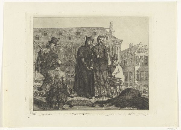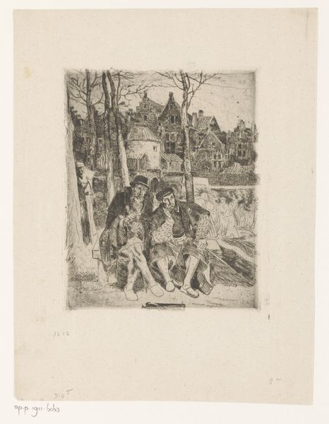 Curator: Immediately striking is the stark contrast achieved within the delicate lines of this etching. There’s an intimacy here, despite the very public setting. Editor: It's wonderfully bleak. The skeletal trees against those clustered houses evoke such a palpable sense of… existential weariness. Almost a haunted quality in the everyday. Curator: That's an interesting reading! The print is entitled "Faust and Wagner," completed in 1869 by Henri Leys. What we're viewing is a depiction of Goethe's famous characters, in what appears to be an ordinary town square. Editor: The attire feels consciously symbolic, doesn't it? Faust, older and more distinguished, perhaps representing wisdom accumulated – or maybe knowledge turned to disillusionment. While Wagner appears in somewhat finer garb, a more ornate design, connoting worldly ties that Faust has abandoned. Curator: And there you see the social element emerging; these figures aren’t just literary archetypes – their fashion reads clearly to the nineteenth-century viewer as signifiers of wealth and class standing in direct conversation with notions of scholarly identity and philosophical debate within rapidly changing social structures. The image seems both rooted in Romanticism, yet very much engaged with the period it was created in. Editor: I agree, though it’s fascinating how timeless the central theme is. Aren't we all continually weighing intellectual pursuit versus lived experiences? What's power but a Faustian bargain writ large? Curator: Yes, and notice the use of the town square—a deliberate placement by Leys to draw lines connecting profound, individualized moral struggle with the public eye. Are we doomed to watch the cycles play out? Editor: So many interpretations can rise to the surface in this piece, and yet it remains anchored by those weary gazes and a feeling of historical inevitability. What better symbol than that? Curator: Precisely. Art such as this reveals just how layered history always is; the cultural impact of Goethe playing off the societal context of artistic production to subtly influence what a work is allowed to communicate, across decades.