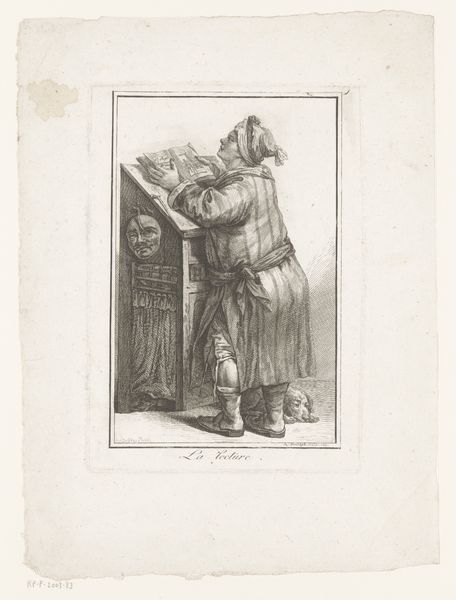 Curator: Oh, isn’t this jaunty? Our spotlight falls upon an etching, "Copy of Le Gentilhomme qui Salue Tenant son Feutre sous le Bras"– try saying that three times fast!– part of "La Noblesse" and rendered between 1625 and 1700 by an anonymous artist. Editor: Dapper, absolutely dapper. Though he looks like he might be perpetually teetering on the brink of toppling over. The detail in that fur cloak—it's decadent! But what's with the shoes? Curator: Callot, most likely, after Callot – though the hand that guided the etching tool is lost to history. And yes, the attire screams Baroque excess. It's a study in the performance of nobility, right down to the rather impractical footwear. Editor: Impractical indeed! He looks less like a noble and more like a theatre performer in a rather precarious position. Are those… roses on his shoes? It’s flamboyant in a way that feels performative, maybe even satirizing the elite. Curator: That's the charm, isn't it? Prints like this were widely circulated, shaping perceptions of class and status. The artist offers a glimpse into the fashionable elite and maybe gently pokes fun. Consider the swagger in that slight bow, the careful placement of his hand—everything is meticulously posed. Editor: And set against this delicate landscape too, making the subject look ever so present and self-conscious in front of everyone. He doesn't melt into nature but performs, which highlights his role in society and adds to the comical vibe. It is staged in a way. Curator: Precisely. It reminds us that images, even centuries old, carry potent social narratives. The attire, the pose, the background—they're all elements within a carefully constructed drama about power, status, and maybe, just maybe, a hint of ridicule. Editor: A rather stylish ribbing, I'd say. And isn’t it amazing how this single image captures the theatricality of an entire era? That furtive humor makes us smile hundreds of years later, looking into those lost eyes. What can you even say. Curator: Exactly, it's almost as if he would suddenly come alive with every tickle of a feather and spring. He still breathes within us, if that makes any sense.