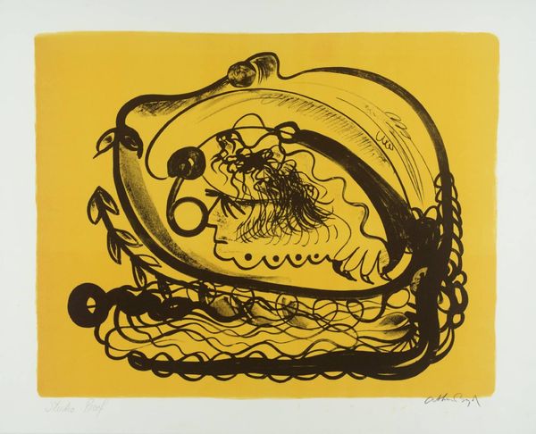 Pierre Alechinsky made this print, "Stars and Disasters", using colour etching, though when, I'm not sure. It’s the kind of print where the process feels really upfront. You can see the hand in the lines and the way the colours are laid down. Looking at the textures, there's a real rawness to the marks. The looping red lines at the bottom sort of remind me of seaweed or entrails. All these weird and funny figures float in and around a yellow and green circle. I love the way the etching has a kind of bite, a slight roughness that gives the image a tactile quality. Think about someone like Joan Miró, who also had this playful, surreal quality, but Alechinsky brings a unique sense of immediacy. It’s like he’s drawing directly from his subconscious. It leaves you with more questions than answers, and that’s what makes it so engaging.