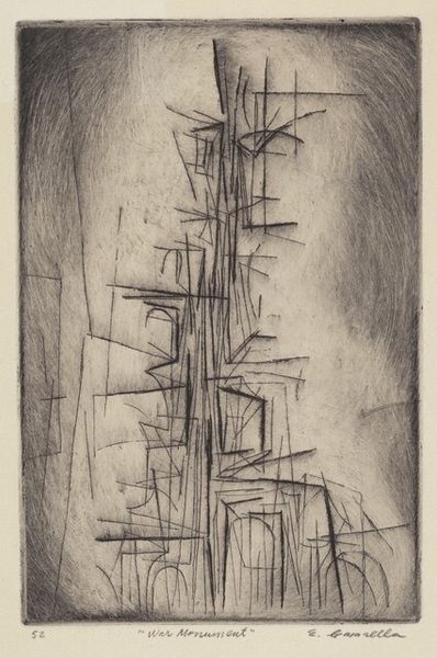 Editor: This is Georgia O’Keeffe’s "First Drawing of the Blue Lines," created in 1916 using graphite on paper. It's strikingly minimal, almost stark, and I'm curious about the story it tells. How do you interpret this work? Curator: It's deceptively simple, isn’t it? Consider the lines themselves. Verticality has always been associated with aspiration, spirituality, even a connection to something beyond. What happens when we offset it with an angled line? Is it a disruption, a questioning? Editor: That's interesting. I hadn't thought of the angled line as a question. It feels… unstable. Curator: Precisely. O'Keeffe was deeply interested in the psychological impact of form. In this era, lines became shorthand for expressing complex inner states. Think about the cultural memory we hold around mountains, valleys, or even horizons. How do those natural shapes resonate with what you feel when viewing this drawing? Editor: I can see that. There's a sense of grounding at the bottom, almost like earth, but then these uncertain lines rising above it. Curator: Yes! And it was titled "First Drawing of the Blue Lines," suggesting it was an exploratory gesture, the beginning of an investigation. O'Keeffe challenges us to complete the picture, perhaps to imbue those abstract lines with our own meaning. Editor: So, it’s almost like she's inviting us to participate in creating the symbol. Curator: Exactly. The cultural and emotional weight shifts to the viewer. Editor: That really changes how I see it. Thanks, I appreciate your insights on how meaning can shift through simple abstract forms. Curator: And thank you. It's a reminder that art is rarely about answers, but often about the enduring questions it poses.