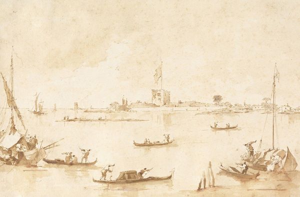 Curator: Look at how Francesco Guardi captures the lagoon life of Venice in "The Lagoon with Boats, Gondolas, and Rafts" from 1758. It’s currently held in a private collection. Editor: It’s evocative; a melancholic sense pervades this Venetian scene, with its murky water and blurred architectural lines. There's almost a haze blanketing the activity. Curator: I see the haziness too. It is true to Guardi’s distinct painterly style; in this oil on canvas piece, he almost obscures class and social strata by depicting all human activity on the water with equal value. What do you make of the artist’s handling of material conditions? Editor: It’s very telling; notice the raw energy with which he uses the oil paint to depict laborers poling rafts—their labour powers these elegant gondolas in their transit between destinations within the city. This economy relies heavily on the work by everyday working men and women! The piece prompts the viewer to recognize the power structures at work within the Rococo-style cityscape itself. Curator: Precisely, and the work sits squarely within debates on value. Guardi situates us, the viewers, in dialogue with the commodification of leisure and the everyday realities of laborers that underpin the facade of the city. Editor: Indeed, by framing gondolas alongside working rafts, the painting asks us to consider what labour looks like when it’s consumed as an aesthetic experience versus a practical activity necessary for subsistence and mobility. The social relations and economies embedded within the painted image, and by implication the Venetian Republic, is built on resource extraction, mobility, and accessibility through human-powered resources. Curator: Guardi leaves us with questions that challenge the picturesque. How are individual agency, economic class, and cultural identity navigated when daily living is a visual experience curated and packaged for foreign elites? Editor: Absolutely, this hazy cityscape reveals just how blurry those class and economic distinctions can be! Curator: I agree, it’s far more politically insightful than its delicate aesthetic first suggests. Editor: For sure, artmaking here serves as the aesthetic device through which to view the social operations and machinations of power as embodied within this Rococo era vista.
