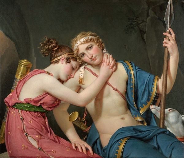 Curator: What strikes me first is the almost tangible sensuality—a quiet intimacy bathed in light. Editor: Right away, my eyes are drawn to the material opulence: the rich folds of the drapery, the intricately carved bedframe, and the luminous flesh of the figures themselves. Tell me more about it. Curator: This is Jacques Louis David’s "Cupid and Psyche," painted in 1817. A late work, it departs from his more severe, politically charged pieces. Here, we see a mythological scene, Cupid and Psyche at rest, intertwined on a lavish bed. It's so much about texture. Editor: Absolutely, there's an intentional display of wealth, and not just divine luxury but also the consumption patterns of his bourgeois clients, who would’ve identified with the comfort displayed. David's Neoclassical restraint is almost pushed to a breaking point by the underlying eroticism. Curator: That tension is key, isn’t it? The Neoclassical form grounding a distinctly Romantic yearning. I feel a pang of bittersweet recognition, a quiet longing… a reminder of beauty tinged with mortality. He achieves a dreamlike state. Editor: Though he depicts mythological beings, it still shows how artistry blends into labor through techniques like glazing and blending to conjure a convincing human likeness. But for whom did David produce it, what purposes did this object fulfill within early 19th century France? It definitely reveals anxieties surrounding pleasure, beauty, and class, now captured through layers of oil. Curator: Exactly. It almost asks us, do we seek truth through pure form, or lose ourselves in the indulgence of feeling? What David gives us here, finally, I believe is not a rigid choice between both, but an invitation to savor the space between— the bittersweet ache of beauty itself. Editor: I concur. While on first glance, an appeal to timeless love and beauty may seem removed from daily experience, David's mastery reminds us that any artwork’s meanings lie buried within material processes, power dynamics, and the consumer choices shaping every delicate stroke and suggestive pose.