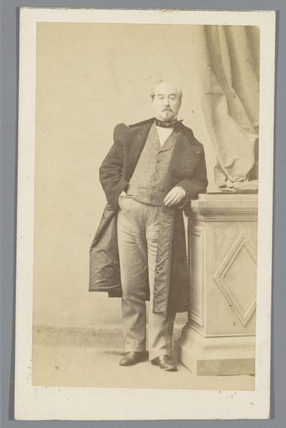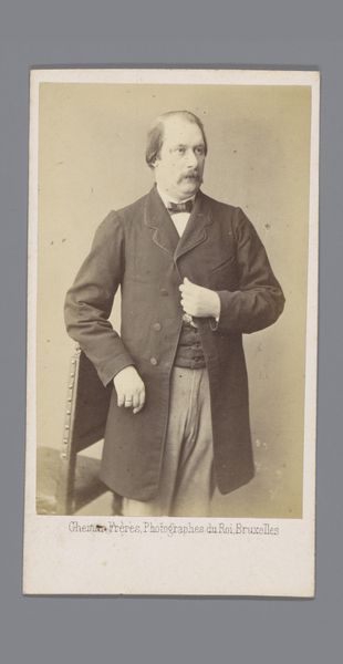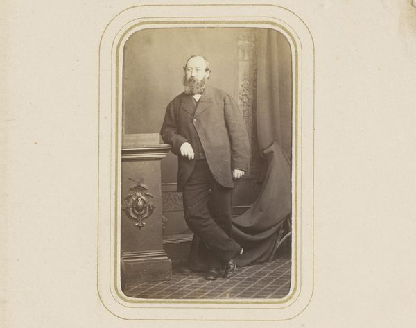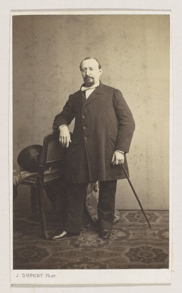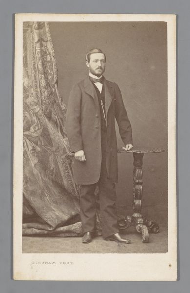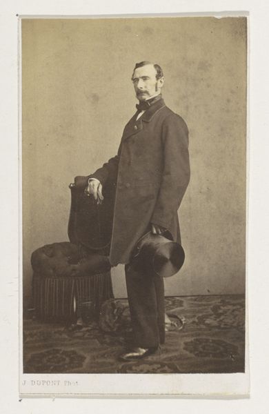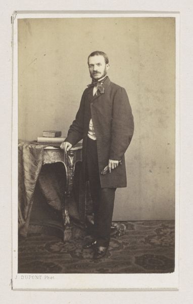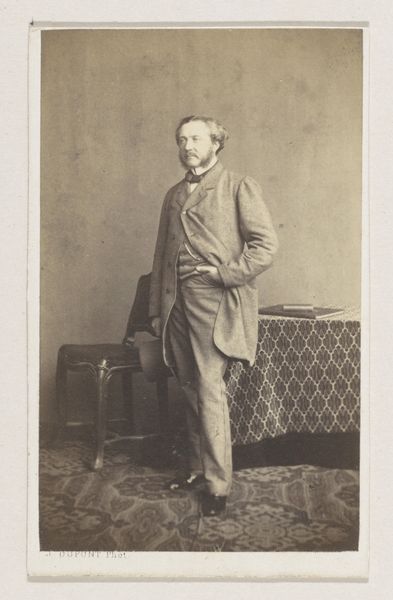 This is a photograph of the painter Ernst Slingeneyer made by Joseph Dupont. The sepia tone casts a uniform light, yet the composition divides into three distinct horizontal bands. The uppermost band is a plain backdrop. Below this sits a table draped with an ornate cloth, its fringe a textural contrast to the smooth background. At the base, a patterned carpet adds another layer of complexity. Slingeneyer himself is positioned as a set of vertical lines. The chair behind him creates depth and visual interest. Dupont's attention to detail, from the tassels on the table to the intricate patterns underfoot, reveals a structured approach to capturing not just an image, but a composed reality. This photograph serves as a study in contrasts and careful arrangement.