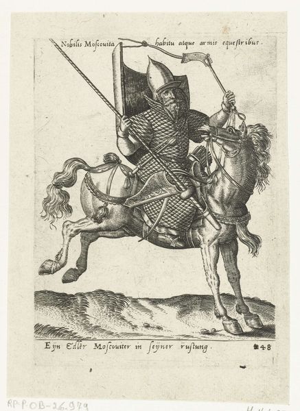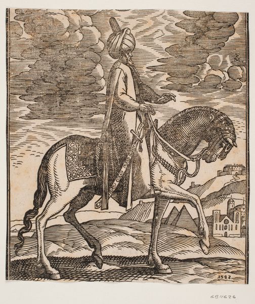 Curator: What strikes you first about this print, I wonder? Editor: It has a very strong sense of formality, almost theatrical. The controlled lines and the meticulous detail give it a stiff, stately feel. Curator: That formality is interesting, especially considering the subject. We are looking at a woodcut from 1576 by Melchior Lorck titled “Bereden standartbærer, profil mod v.; standarten er 3-fliget og under den er ophængt en fjer; hans sværd anbragt mellem hans v. ben og hestens flanke,” which translates roughly to "Mounted Standard Bearer, profile to the left; the standard is three-part and a feather is hung under it; his sword placed between his left leg and the horse's flank." Editor: That title is… remarkably specific. Is the focus really on the subject or the symbolic representation of power through the standard? I wonder, considering it's the Northern Renaissance, what political narratives or commentary is present? The figure, identified as a standard-bearer, could represent any number of imperial armies, so I am interested in exploring whose "truth" Lorck represents in this portrait. Curator: Your interpretation touches on important layers. The very act of depicting a "foreign" figure, a person probably of Ottoman descent judging from his turban, and depicting him as a military man reveals much about Europe’s relationship with the "East" during this era. And how he presents that person matters enormously, the work shows a strong Ottoman warrior ready to fight. Editor: It absolutely shapes the European perspective and that makes me uncomfortable, especially as an activist, looking at this image, it begs to raise the issue of historical misrepresentation and the creation of stereotypes. Art in the Northern Renaissance was often propaganda for their particular worldview. Curator: Exactly. It underscores the politics of image-making and how it played a part in shaping perceptions of "the other". It’s a portrait of power but power always rests within particular contexts and agendas. The figure is elegant, but the art object, for consumption by whom and for what reasons, really does matter. Editor: It gives a great insight into the historical forces at play and into who decided who gets to tell what stories about who. A fascinating and sobering point, thank you. Curator: It highlights art’s engagement within a context where we get to investigate those complicated narratives.