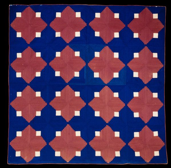 Editor: Here we have an anonymous quilt top, dating back to the 19th century, made from cotton textile. The red and white are so striking, and there's something comforting in the geometric repetition. What draws your eye to this particular work? Curator: Primarily, the structural arrangement. Observe how the maker employed the star motif, strategically positioned across the plane. The chromatic tension between the saturated reds and the stark whites generates an optical vibration, doesn’t it? Notice also the bordering, which frames the internal geometry with controlled linearity. Editor: I hadn’t thought about the bordering in that way. It does seem to contain the energy of the central pattern. Is the asymmetry intentional? It seems like a break in the pattern. Curator: An astute observation. One might interpret it as a deliberate subversion of rigid formalism, a subtle rebellion against absolute symmetry. Such imperfections introduce dynamism. It disrupts any expectation of strict adherence to a grid, provoking a certain cognitive engagement, wouldn’t you agree? Editor: Yes, I think I do! It makes the piece feel more human, and less like a perfect machine-made object. Are those tiny blue triangles creating movement too, by directing the eye across the design? Curator: Precisely. They establish vectoral relationships within the composition. We find our sight led to circulate through this composition by their careful, repeated positionings in connection with the stars and bordering shapes. Editor: I’m starting to appreciate how much intention is woven into the design, it gives more appreciation of how textile folk art challenges preconceptions. Curator: Indeed. What was initially received as functional transforms into an intricate network of relationships in pattern and materiality, inviting layered interpretations.
