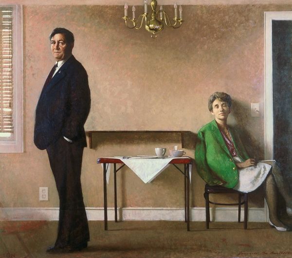 Editor: Joseph Lorusso’s painting, "After Hours," rendered in oil paint, presents a compellingly intimate scene. The somber color palette gives it a nostalgic feeling. What visual narratives or cultural memories do you see at play here? Curator: This image feels like a glimpse into a private world. The lighting is particularly evocative, drawing a stark contrast between the floral wallpaper and the figures in the shadowed doorway. What objects stand out to you and what could they symbolize in this "After Hours" moment? Editor: The flowers in the vase and the cigarette certainly stand out. Maybe the flowers represent fading beauty or affection and the cigarette could symbolize anxiety. Is it reaching too far? Curator: Not at all. Flowers often function as symbols of beauty and its transience. The cigarette, an almost ritualistic act in times of stress or contemplation. Think about how such ordinary items acquire emotional weight. Does the couple remind you of a historical memory? Editor: I didn't notice! Now that you mention it, the painting has echoes of Hopper. Are we, the audience, included or are we kept at a distance by its voyeuristic feel? Curator: I think the artist consciously employs visual language which refers to a shared vocabulary for "urban loneliness". What do you make of the woman’s gaze and its role for the viewer? Does she acknowledge our presence, or are we intruding? The emotional tension seems palpable because we look through "windows of souls." Editor: I hadn't considered the gaze like that. That really changes how I see their relationship in this scene. I'll keep that in mind while I research more on visual codes in Lorusso's work.