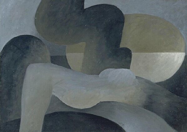 Curator: "Den vaknade vidden," or "The Awakened Expanse," an oil painting crafted by Sven Jonson in 1935, invites us to consider the landscape through the lens of geometric abstraction and surrealism. Editor: Well, right away, this feels like a place I've dreamed of, or maybe seen in an old sci-fi novel. Kind of desolate, but not without a strange, quiet beauty. What do you see in it? Curator: I'm immediately drawn to how Jonson challenges our understanding of nature. These aren't landscapes rooted in reality; rather, they are explorations of space and form. I'm particularly struck by how the geometric shapes contrast with the naturalistic colors. How the artist's application creates soft edges around these seemingly rigid masses, almost like half-formed memories rising from the plains. Editor: Absolutely, these monumental structures remind me of half-remembered ancient gods. It’s like a temple was erected on a far distant planet. Curator: Yes, I can see that. And if we consider Jonson’s socio-political context during the interwar period, this abstracted landscape can be read as a reflection of the era's anxieties and uncertainties. The expansive yet desolate scenery prompts introspection about the state of the world, about the collapse of prior societal beliefs in the face of modernism. Editor: That makes a lot of sense. I'm thinking, too, about the almost cartoonish blob floating up in the right corner... whatever could it mean? Curator: Perhaps a distant planet that the monoliths yearn to return to. The way Jonson merges familiar landscapes with surreal elements encourages an emotional response. Editor: In other words, Jonson wants us to create a personal story to better digest those uncertainties you described. The soft and warm desert color pallette softens some of those uncertainties. Almost like remembering warm summers after having survived a particularly harsh winter. This helps ground the scene with elements of hope and the persistence of life despite what we're told is bleak. It’s a landscape of internal states. Curator: Precisely! A landscape imbued with personal and collective narratives. Editor: So, next time you wake from a disorienting dream, you'll know just where to look for answers. Curator: A powerful testament to the enduring power of art as social commentary.