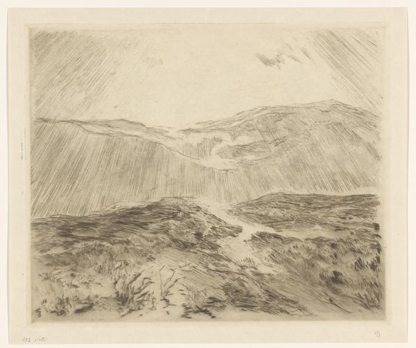 Editor: This is "Boslandschap," a landscape from somewhere between 1840 and 1880 by Johannes Tavenraat, rendered in watercolor and charcoal. It’s a very atmospheric piece; I’m immediately struck by the use of light and shadow and the rather muted palette. What do you see in this work, especially considering its possible context in Romanticism? Curator: I see an exercise in visual memory and longing, archetypal themes within Romanticism. Consider how Tavenraat employs washes of watercolor—almost like capturing a fleeting, half-remembered dream of nature. Does the limited color palette evoke a specific emotion in you? Editor: It definitely feels melancholic. Almost as if the color has been washed away by time. Curator: Exactly. That faded quality can be seen as a symbol itself, resonating with the transient nature of experience and the past. The broad strokes create the illusion of depth, don’t they? Notice how the artist has used implied lines to pull the eye towards the horizon? What does that journey towards the background suggest to you? Editor: Perhaps a longing for something distant or unattainable, or maybe even a connection to nature. It makes me feel contemplative, for sure. I hadn’t considered the path as a symbolic element. Curator: Indeed. The path, rendered so simply, acts as a symbol of journey. It is a powerful emblem, deeply embedded within our cultural consciousness. I suppose both landscape and memory are ways of orienting oneself. What have you taken from this encounter? Editor: I see a depth of symbolism in what I initially perceived as a simple landscape. It’s really made me consider how much historical context can shape our understanding and feeling towards an artwork.