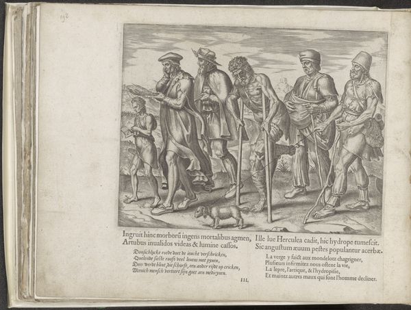 Editor: Here we have Giovanni Ostaus's engraving from 1567, titled "La Vera Perfettione del Disegno di varie sorte di recami, page 23 (verso)." The detail is quite amazing. It almost feels like a stage play frozen in time, a story unfolding, yet static. What jumps out to you when you look at this image? Curator: The Judgment of Paris, presented within the visual vocabulary of the Renaissance, certainly strikes a chord. What truly resonates with me is how Ostaus encapsulates a profound cultural anxiety around beauty, power, and desire. Consider how Paris, rendered almost as an outsider with his garb, is poised to choose amongst these goddesses. Their nudity is not merely aesthetic; it signifies vulnerability and a raw offering of their essence. Do you notice Cupid at his feet? Editor: Yes, almost like a guilty conscience. It feels significant that Paris is clothed, while the goddesses aren’t. He holds power and agency in that choice. Curator: Precisely! And this reflects a common Renaissance trope. Clothing denoted status and civilization. By undressing the goddesses, Ostaus strips them of their societal power, reducing them to their essential attributes as perceived by the male gaze. That gaze, then, carries centuries of weight – the objectification and idealization of the feminine. The mountain in the backdrop looms, representing the immovability of fate. What consequences await Paris based on this momentous choice? Editor: That’s a great point. The mountain is not necessarily “pretty” but immovable, towering over the narrative as a consequence of his actions. It makes you wonder about the concept of ‘perfection’ as laid out in the title, when Paris can only make an imperfect, and consequential, judgment. Thank you, that has really shed new light on the symbolism within the piece. Curator: It reveals how even seemingly straightforward historical scenes hold layers of complex societal commentaries, continuing to spark discussion.