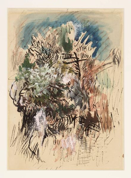 Curator: Welcome. We're standing before Marc Chagall's "Mariage au grand bouquet," an oil on canvas created around 1979. This piece encapsulates Chagall’s enduring themes of love, community, and memory. Editor: My first thought? Overwhelming! But in a joyful way. Like walking into a flower shop run by a mad genius who’s also a romantic poet. The whole thing vibrates. Curator: It does possess an incredible dynamism. Chagall consistently explored themes of love and partnership through a deeply personal lens. Looking closer, we see not just a wedding but an entire community. Consider the figures on the lower left, the village bustling around the central couple, representing continuity and shared experience. The floating figures at the top create this circular motif. Editor: True. There’s that dreamy, folksy vibe he does so well, like a childhood memory that's gotten wonderfully exaggerated over time. I’m drawn to the palette—muted, yet saturated with those flashes of red. What I interpret in those circular, floating figures is something so fundamental to marriage; how our relationship can connect to a lineage and set of roots larger than ourselves. The work acknowledges its cultural history as foundational for future identity making. Curator: Absolutely. The iconography in Chagall's work, his persistent use of these figures and symbols is critical to understanding his work within the landscape of expressionism and romanticism. And indeed, what is significant is not merely the union of the couple, but also how that singular identity forms from this intersubjective set of exchanges. Editor: Right! Plus, who can resist that bouquet? It dominates everything, a total explosion of color. The scale is bonkers; it overshadows everyone. Almost comical! And the couple feels small, sheltered by all those green layers, enveloped. Curator: That is the focal point, isn’t it? Perhaps that emphasizes the vitality and generative power that the union signifies. A marriage's growth and potential is like an enormous bloom with boundless promise. Editor: This feels especially important when considering Chagall’s work now. Love—in a very complicated world, surrounded by chaos. Beautiful. Curator: Indeed. The work's strength is, that it reminds us that even amongst disruption, rituals that unite us can flourish. Editor: This feels like a blessing for uncertain times. Let’s go find more!