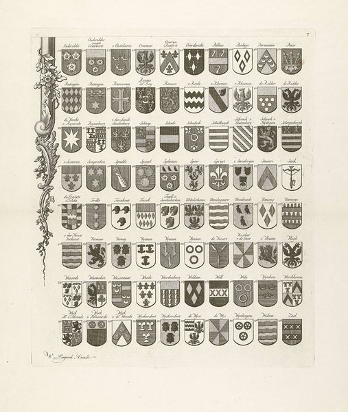 Editor: This is "Blad met de familiewapens van negen geportretteerden," from around 1690 to 1713. It's a print—an engraving—by an anonymous artist, here at the Rijksmuseum. It seems like a formal display of power. All these heraldic symbols neatly arranged. What do you see in this piece? Curator: I see the laborious process of creating these engravings. The artist, whoever they were, was meticulously reproducing symbols of power. Consider the economy of labor: who commissioned this work? Who printed it, and for what audience? The material – the paper, the ink – speak to a system of production and consumption. These armorial bearings signify elite families, but also a whole system that allowed their representation. Editor: So, you’re thinking about it less as a symbolic representation of these families and more about…the printing itself as a system? The “how” of its existence? Curator: Precisely. Look at the repetition of form. Nine shields, each variations on a theme, all reproduced through essentially the same mechanical process. Are we to consider the labor that went into them? Or, instead, focus on the social structures reproduced by each subsequent print? How did the materials – the copper plate used for engraving – play into artistic standards? Was this ‘art’ or craft? Where was the divide then? Editor: That's a really interesting angle. I was initially focused on the families represented and what those symbols meant, but thinking about the production changes things completely. It seems the act of reproduction becomes a crucial part of the meaning itself, embedding these heraldic symbols further into societal structure and confirming this system to this very day. Thank you. Curator: It shifts the emphasis, doesn’t it? From simple representation to an understanding of how material culture actively shapes our understanding of power.
