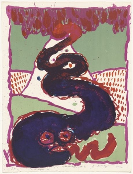 Curator: Immediately striking, isn’t it? Like a memory, vivid yet incomplete. Editor: Absolutely. This untitled work by Harold Cohen from 1968 uses screenprint to depict what appears to be a face in startling yellow against a purple ground. There’s a sense of fragmented identity. Curator: Yes, the high contrast palette lends itself to that feeling, doesn't it? Yellow has often been used to signify decay, illness, or a corrupt state of mind, contrasting with the evocative symbol of royalty that purple has traditionally been. The lips are particularly arresting – soft, sensual, but slightly disturbing in their isolation. Editor: It's interesting to see how Cohen uses such visceral, almost primal imagery. It reminds me of early portraiture, where faces weren't just likenesses, but symbolic representations of power or the soul. Curator: I suppose, on reflection, there’s a very raw, almost aggressive honesty to this piece. It’s like a half-remembered scream, elegantly framed. Editor: Exactly. It prompts us to consider the duality within ourselves, doesn’t it? The tension between beauty and decay, the known and the unknown.