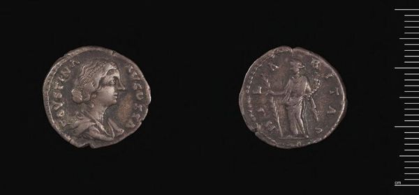 Curator: This is a denarius of Faustina II, crafted under the reign of Antoninus Pius. Look at how small it is! Editor: It feels weighty, though—like a tiny monument. The wear and tear whisper stories of countless transactions, lives touched. Curator: Absolutely. One side depicts Faustina herself, regal in profile, while the reverse shows a standing figure. I wonder what that figure symbolized to people at the time. Editor: Perhaps an idealized representation of femininity in Roman society? Or maybe the literal weight she carried as a woman in power? Curator: It is funny to think that something so small would hold so much history and perhaps, power. Editor: Exactly. It makes you ponder the value we place on such objects. Curator: These small objects are powerful in their way. Editor: Definitely. Even now, they offer fascinating lessons about the enduring legacies of women.