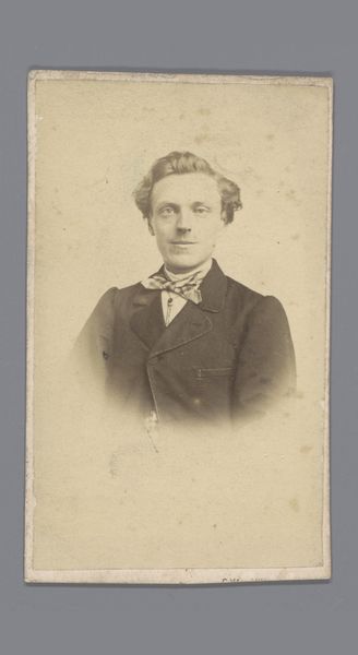 Editor: Here we have "Portret van een onbekende jongeman" - Portrait of an Unknown Young Man – dating from around 1861-1915. It's a historical photograph by Carel Eduard Westerborg, using the albumen print technique. He has such a calm face, like he knows something we don’t, I'm wondering what secrets that little table holds, you know? What do you make of this work? Curator: That’s a keen observation! It strikes me that his relaxed posture, leaning against that decorative table, really tells us something about the changing times. Photography was still relatively new, right? Yet, this young man seems so at ease with the camera. Do you see a hint of rebellion in his eyes, or is it just me projecting my 21st-century sensibilities? Editor: Rebellious? Hmmm… I initially saw him as more contemplative than defiant. Maybe it’s just the sepia tones influencing my perception? Curator: Could be. That sepia, which results from the albumen printing process, certainly lends a melancholic, almost nostalgic air to the image, doesn’t it? The formality of the portrait is a marker of the time, but the naturalness of his pose feels quite modern. Also, is it just me, or does that tiny medal or emblem he's wearing look incredibly intriguing against his somber outfit? Makes me wonder what organizations were popular at that time. Editor: Now that you point it out, that emblem DOES stand out! It adds a layer of mystery, for sure. And I hadn't considered the modernity in his pose. Good point! Curator: It's always rewarding to see a figure from history who seems to connect with us across time. To capture this young man’s thoughtful character in that era – a feat, wouldn’t you say? I suppose if we only knew the real stories… Editor: Absolutely. Thanks for that wonderful look. Now I see this unknown young man and his simple portrait through a different, intriguing light!