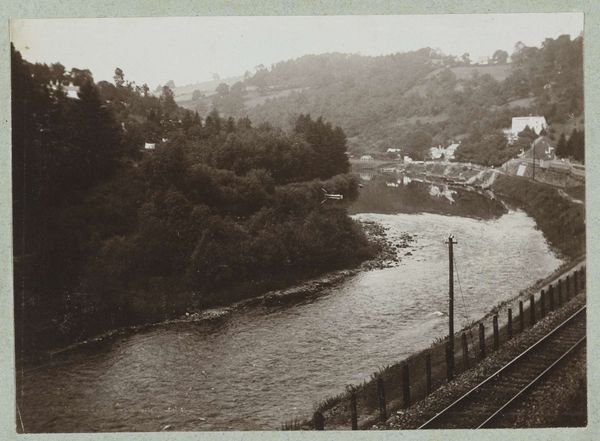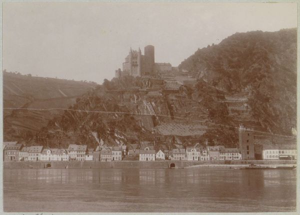 Editor: This is “Gezicht op Uzerche aan de Vézère,” taken in 1903. It’s a photograph, and it depicts a cityscape along a river. The sepia tone gives it a feeling of looking into the past, and I'm drawn to the contrast between the grand buildings on the hill and the more humble structures by the water. What draws your eye when you look at this image? Curator: I'm immediately struck by the process itself. This is a photograph from 1903. How did Delizy access these new materials? Who printed it? Are the chemical processes visible? It raises questions about accessibility to photographic technology at the time. Photography was still relatively novel. How did it shift how landscapes and labor were being depicted? Editor: That's a really interesting point! I hadn’t considered the production and the access. The act of capturing a scene like this with the tools available then, it must have been quite something. Do you think that impacted the aesthetic choices of photographers like Delizy? Curator: Absolutely. The material conditions shaped the final product. We have a unique tone given that this piece is on photographic paper. Look closely; you can see imperfections and textures that wouldn’t be present in a contemporary digital print. I believe this is central to the work's character and value. Do you notice anything else that alludes to labour? Editor: The positioning of the working buildings so close to the river, at the foot of the upper city, hints at some sort of access for labour or trade to move in and out. Seeing how art is shaped by practical processes and material realities gives me a much more solid appreciation for the artist's skill! Curator: Indeed. Focusing on materials and social context shows us how art reflects, and is even shaped by real-world conditions. I never thought about it so literally before.