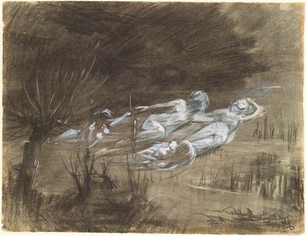Curator: Welcome. Before us is Edvard Munch’s lithograph, "Woman and the Snake," created between 1908 and 1909. It’s currently held here at the SMK, the National Gallery of Denmark. Editor: Immediately, I feel this primal quiet. The ink bleeds just so, creating soft edges and this almost secretive mood… the woman’s eyes… distant. Curator: Right, Munch consistently explored these primal themes of love, fear, and death in his oeuvre. We can interpret the "Woman and the Snake" in that context, considering the role of women as both life-givers and figures of temptation as perpetuated in art and culture. Editor: Temptation, yes, absolutely, but also there’s something vulnerable here. She’s not Eve in a garden, sly. More like someone half-dreaming… almost merging with the snake… accepting its presence as if it were a natural extension of herself. Maybe it represents a hidden side? The woman as medusa… both are ostracized, isolated figures from folklore... Curator: Yes, and such visual themes recur across movements during this period as part of a larger phenomenon of representing internalized female sexuality. The framing of Munch’s work in his contemporary exhibitions, for example, encouraged exactly such psychological and cultural readings of female representation. Editor: And speaking of exhibition, notice how simple, how economical, the rendering of landscape is… The composition directs our eyes immediately to the intimate scene between the woman and this… serpent confidant. It makes the experience extremely internalized... and what about the shadows suggesting an outside space? I feel there is a need for comfort there... maybe suggesting that our traumas are never resolved behind walls... Curator: I agree completely. Munch clearly presents that discomfort with himself throughout his lifetime. This piece showcases his talent for visualizing anxiety within human interactions. By grappling with anxieties through figuration, it almost demands from us an emotionally-intelligent response. Editor: Right, anxieties… Or a strange, forbidden peace found in embracing… well, embracing our inner serpents! We carry this piece now to add our modern anxieties, I guess. Curator: Indeed. Art persists through its ongoing interactions with viewers in novel and unexpected situations. Editor: So true. What seemed pertinent then in society, now appears new again with time!