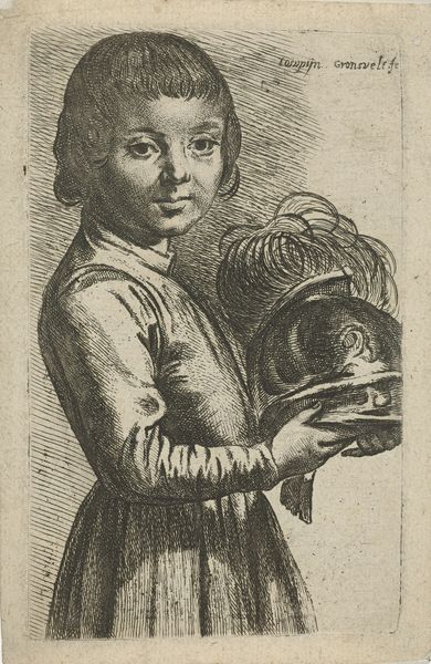 Editor: This is Lambert Visscher's "Laughing Boy with Cat," an engraving made sometime between 1643 and 1690. It's mostly line work, isn't it? All those tiny marks… What strikes me most is the contrast between the brick wall and the soft textures of the boy's hair and fur of the cat. What do you make of this piece? Curator: Consider how the engraving medium itself affects our reading. An engraving allowed for mass production of images and the distribution of art to a broader audience. It collapses distinctions. Do you think the choice of material elevates or diminishes the subject? Editor: Diminishes? I suppose… paintings often get more attention than engravings, but it seems more democratic. Did prints have other functions in seventeenth-century Dutch society? Curator: Precisely. Engravings served a crucial role in disseminating visual information. Reflect on the labor invested in creating the printing plate, and how the market shaped the themes and subject matter in art. Editor: That's interesting! So, this smiling boy with his pet wasn't just art for art's sake? There's something about accessing art more widely that makes it worthwhile even if it’s “just” a print. Curator: The artist, Visscher, surely was responding to a commercial opportunity in making such a common-life image. Do you think it might change how you view similar works in other mediums like painting? Editor: Absolutely. It definitely makes me think about who had access to different kinds of art and how that shaped artistic choices. Thanks for making me think about art this way! Curator: It makes me see it anew too. Thinking about the accessibility of materials and process allows for an entirely different reading!