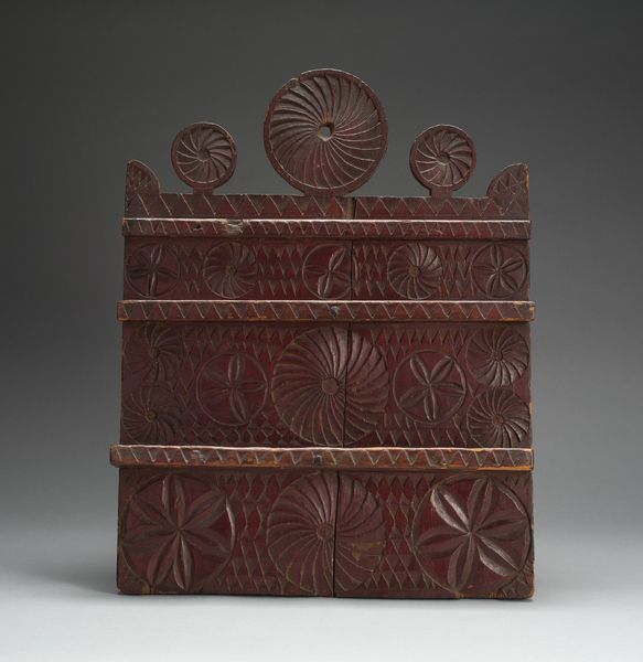 Editor: We're looking at a cast iron fireback from the Hopewell Furnace, dating to around 1795-1800. The relief sculpture is pretty striking; there's this intense symmetry and a surprising level of detail considering it's a functional object. What can you tell us about it? Curator: This piece exemplifies how neoclassical aesthetics infiltrated even the most utilitarian aspects of early American life. Note the material itself, cast iron. Its production signifies industrial labor and resource extraction from a specific geographical and social context – Hopewell Furnace. It's not just about aesthetic pleasure; it’s about the labor required, the mines exploited, and the societal structures supporting that process. Editor: So, beyond the decorative elements, you see the labor and the raw materials speaking to a larger system? Curator: Precisely. The "high art" references—the symmetry, the relief sculpture—are superimposed onto an object directly related to domestic labor. Where was this fireback likely positioned within the home, and what activities would it have been related to? Considering this provides a powerful insight into the lives and social relations during its use. The neoclassical imagery wasn't just for show; it was integrated into the daily lives and activities supported by this piece of ironware. It attempts to beautify and thus, legitimize the materiality of domestic activity within the ideals of emerging American taste. Editor: That’s a fascinating way to look at it. It’s easy to see it as simply a decorative object, but understanding its production and the lives it impacted changes everything. Thanks. Curator: My pleasure. Thinking about art's material conditions, and its place in wider historical processes is critical for any thorough interpretation of historical decorative art!