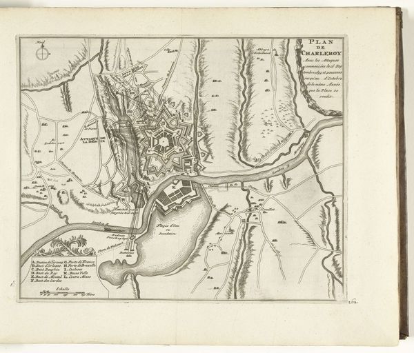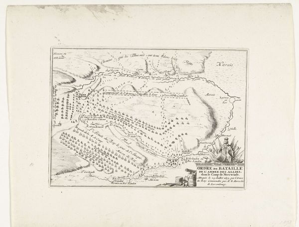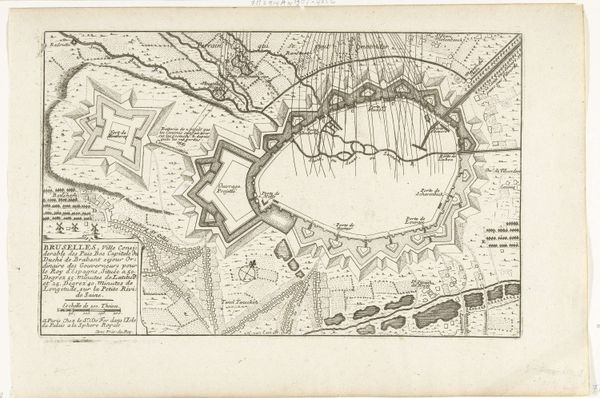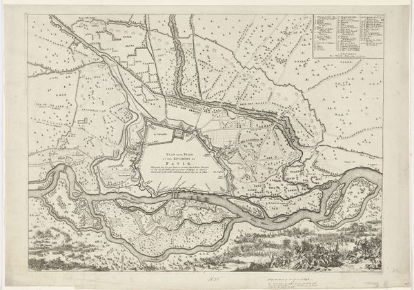 This is an anonymous map of the siege of Gennep, dating back to 1641. It's an etching, defined by dense, precise lines that illustrate a bird's-eye view of the military action. The composition is dominated by the river that snakes through the landscape, dividing the territories. We see structured fortifications and battle formations, rendered with remarkable detail. The lines create a textured surface, illustrating fields, fortifications and troop deployments. What's interesting here is the tension between objective representation and symbolic encoding. The map aspires to be a factual document of a military event, but it is also a highly constructed image. The organization of space, the strategic placement of elements, all serve a purpose beyond mere information. It reflects the period's interest in portraying not just the 'what' but the 'how' and 'why' of territorial control and military strategy. Notice how the lines create a sense of order, imposing a structure upon the landscape. This speaks to the broader cultural impulse to categorize, control, and understand the world through rational frameworks.