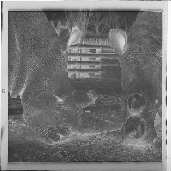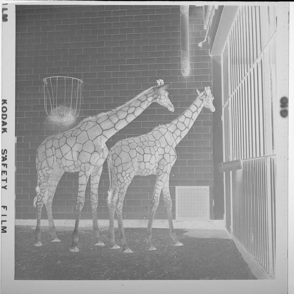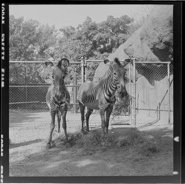 Curator: This is Jack Gould's "Untitled (two zebras at zoo)," a small, undated gelatin silver print from the Harvard Art Museums collection. The stark contrast gives it a rather surreal quality, don't you think? Editor: Yes, the inverted tones create an unsettling feeling, especially juxtaposed with the subject matter. The confinement of the animals really emphasizes ideas about control and the exoticization of the other. Curator: Absolutely, and it prompts questions about the historical context of zoos, their role in colonialism, and the ethics of keeping animals in captivity for human entertainment. Editor: Looking at the composition, the overlapping zebras and fence create a sort of visual cage within a cage, amplifying the emotional impact. Curator: Indeed. The inverted colors and the zoo setting encourage a critical examination of human-animal relationships and their underlying power dynamics. Editor: The interplay of light and shadow also speaks to the semiotic relationship between visibility and invisibility in constructing perceptions of the wild. Curator: I appreciate how this print offers us a space to consider complex social and ethical questions, even without explicit narrative elements. Editor: It's a potent reminder that even seemingly simple images can hold layers of meaning, inviting us to reflect on broader cultural narratives.