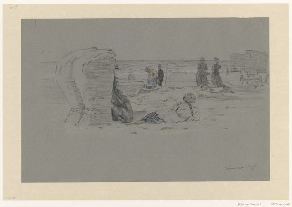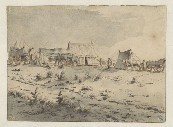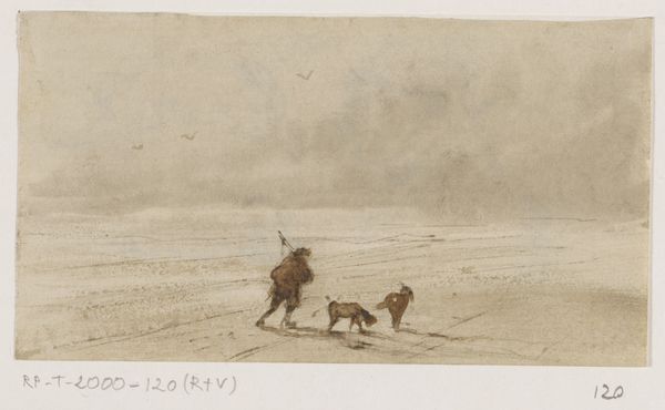Editor: This watercolour on paper, "Landschap in de duinstreek met jagers en honden," or "Landscape in the Dunes with Hunters and Dogs," made sometime between 1840 and 1870 by Johannes Tavenraat, has a quiet melancholy feel, don’t you think? What’s your reading of it? Curator: A melancholic mood resonates, absolutely, but it’s more like a quiet rumination on nature's embrace. You almost feel like you are entering the painter’s memory... look how fleeting and dream-like the forms appear, yet filled with sharp strokes. Did you notice how that windmill mirrors the gestures of the hunters? As if time is a gentle spiral, going from the every day towards something deeper. Editor: That's a very poetic perspective! I was just seeing the stark simplicity, how the figures kind of blend into the landscape. I guess I wasn't reading deeply enough! Curator: Oh, but simplicity holds its own potent magic! It allows us room for reverie. What does it say about human endeavor? They appear minuscule compared to the vast, rolling dunes. Perhaps Tavenraat wanted to capture the human connection to nature and not necessarily their mastery of it. What do you think about that? Editor: I think I agree! It seems to ask about where we stand in the larger scheme of nature itself, not just a pretty landscape or simple scene. I hadn’t thought about it like that! Curator: Beautiful! That’s art's greatest gift, the capacity to keep making us ask again, isn't it?