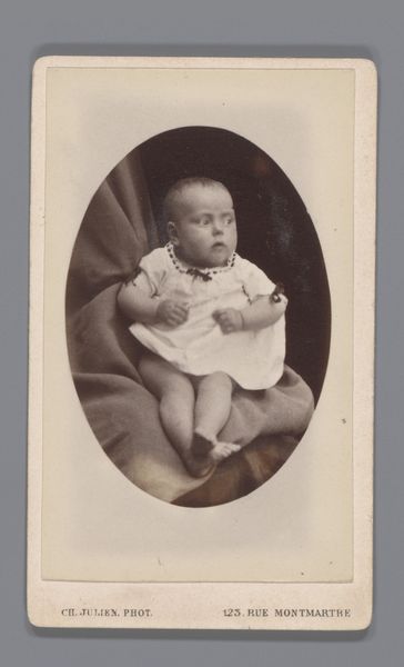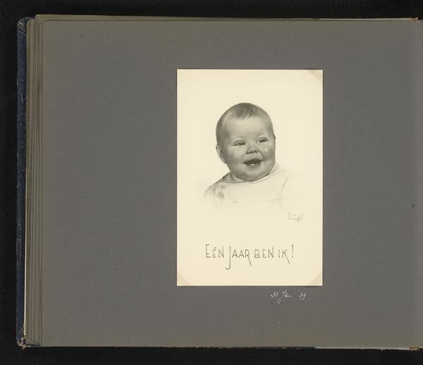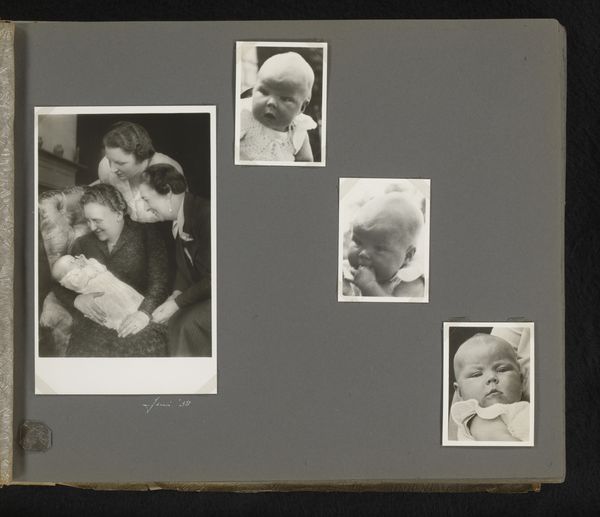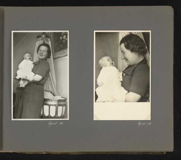Editor: This albumen print is titled "Prinses Beatrix," taken in 1938. There’s something incredibly sweet about these portraits of a baby – a future queen! What strikes you when you look at this photograph? Curator: It is captivating how photographs act as time capsules. Here, we see two images on a single page, side-by-side—two moments, framed. Note the textural qualities—the delicate knit of the baby’s garment, the soft gradations of light. These details speak of care, of preservation, but they also tell us about societal values. What do you notice about how Beatrix is being presented to the world? Editor: Well, she’s dressed in delicate, crocheted clothing and seems to be the entire focus. One image even features her with a doting parent! There's almost a performative aspect, knowing she would one day rule. Curator: Exactly. Babies, especially royal babies, are potent symbols of hope, legacy, and continuity. Think of icons such as the Madonna and Child – universal symbols, re-enacted with Beatrix. The composition isn't just a snapshot; it’s a careful construction meant to project very particular meanings about family, dynasty, and the future. How might people at the time have interpreted this image versus how we perceive it today? Editor: That’s fascinating. Back then, perhaps it was pure adoration and aspiration. Now, knowing her reign and legacy, we see the start of a historical narrative, like viewing a mythical origin story. Curator: Precisely. It also makes one think about the private and the public personas merging from the earliest age. A baby isn't just a baby; she’s an icon in the making. I wonder how the choice of black and white enhances this symbolic elevation? Editor: It lends it a timeless, almost monumental feel, removing it from the everyday and placing it in the realm of history. It's been really interesting to unpack the cultural weight these seemingly simple photos hold.