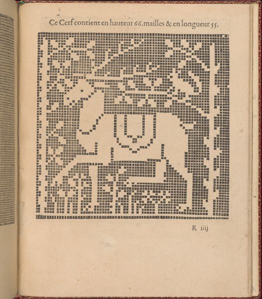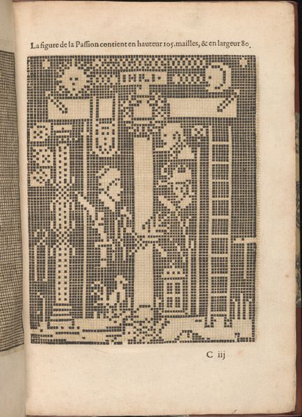 Editor: So, this intricate page is from Federico de Vinciolo’s “Les Singuliers et Nouveaux Portraicts…,” dating back to 1588. It looks like a printed page showing a grid of squares, which together seem to create an image. My initial thought is how digital it appears, almost like early pixel art. What strikes you most about it? Curator: The most fascinating aspect is its intersection of artistry, craft, and early forms of technical documentation. These "portraits" aren’t meant to hang in galleries. They served a very specific social purpose, dictating ornamental needlework and lacework patterns. In a pre-digital age, Vinciolo offered standardized designs to a largely female artisan class. Think of this page not just as art, but as an early form of mass media aimed at shaping fashionable aesthetics and economic opportunities for women. Editor: That’s an interesting point. I wouldn’t have thought of it as a political object. How does its medium—printmaking—affect how we see its cultural significance? Curator: Printmaking democratized images. Vinciolo’s designs became accessible and repeatable across a broad spectrum. That changes how we assess artistic genius. It moves from individual mastery to influence on popular taste and craft traditions. The printing of design guides cemented and standardized particular tastes in Europe. Editor: So, its real impact lies in how it influenced broader visual culture and the work of artisans? Curator: Precisely. It shifts the focus from individual artistic genius to the social and economic impact of visual instruction. Editor: This has changed how I see it completely. Thanks! Curator: Likewise, seeing it through the fresh lens of "pixel art" makes me think about the continuities between early craft patterns and contemporary digital design.