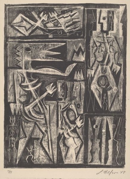 Curator: Erich Müller-Kraus's 1932 linocut, titled "Revolution," immediately grabs attention with its striking monochrome composition. The printmaking process, inherent to linocut, emphasizes bold contrast. The work presents a tension between figuration and geometry. Editor: It certainly does, there's a real sense of unease evoked through the figures; a faceless crowd flanking what seems like a symbolic central figure of authority or perhaps even…sacrifice? There's a strong feeling of questioning woven into it. Curator: The flat colour and historical fashion add to the drama of the composition, highlighting the texture achieved by carving into linoleum. Consider how Müller-Kraus employed tools like gouges to create this bold imagery from a single block of material. Editor: Absolutely. Contextually, post-World War I Germany witnessed the rise of fascism. I see this print as reflecting the anxieties and ambiguities that pervaded that era. That lone figure with a question mark hovering above it feels incredibly pertinent in an age of uncertainty. What questions are being asked about power, obedience, and the human condition? Curator: Linocut, as a medium, lent itself to mass production, enabling artists to disseminate their messages widely and at relatively low cost. Was this artwork presented as propaganda? What do we know about where Müller-Kraus fit into that society? Editor: I believe that’s the real point here; "Revolution," through its symbolic language, acts as a form of social commentary and encourages reflection on that period's profound upheavals. We have the cross on a central figure, a visual pun embedded into this "Revolution". It’s loaded with political implications. Curator: Understanding the limitations and possibilities inherent in the linocut process enables us to more clearly appreciate Müller-Kraus' artistic vision and skill. It provides a context, I think, for considering revolutionary materials. Editor: Indeed, Müller-Kraus gives us a sharp image to contemplate and deconstruct a turbulent chapter in history. Curator: Yes, this examination reminds us that revolutions can take many forms: the toppling of social norms, a radical shift in art, and yes, of course, even something as deceptively simple as a black and white print.