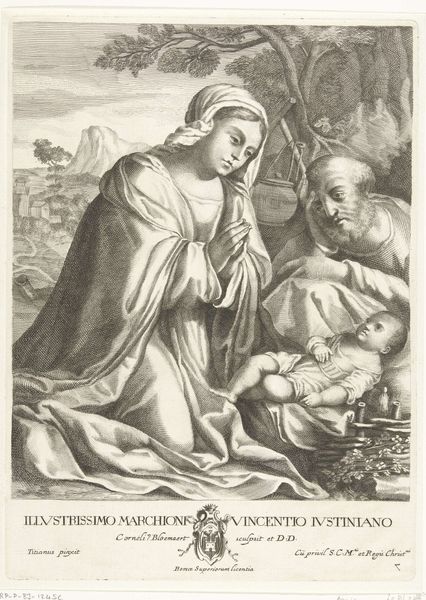 Curator: Looking at this engraving by Gérard Edelinck, dating sometime between 1666 and 1707, it’s hard to not be struck by the serene balance and clarity of form. What is your initial reaction? Editor: Well, aside from the visual feast that baroque religious art typically offers, I am immediately drawn to the emphasis on materials. We have the depiction of linen, wool, and textiles so prominent, alongside the labour of their making. This directs attention to the tangible efforts embodied by the Virgin, which, considering the labour usually assigned to women in the time, is very notable. Curator: Absolutely, the tactile rendering of those fabrics is masterful. But observe how Edelinck uses line and form to create a visual hierarchy, leading our eye from the angels above to the central figures of Mary and the Christ child. The composition, relying on clear, idealized forms, serves to elevate the subject matter, pulling us into a theological realm. Editor: Theological perhaps, but also intensely human! This isn’t some remote deity; we are seeing a depiction of domesticity. Her labour has earthly purpose. What material conditions enabled such luxury to become the theme of an artwork? We must also consider this question of the social fabric in which art like this emerges. Curator: And, beyond that social framework, consider how the swirling lines, the contrast between light and shadow—the formal qualities—draw our attention to her face, highlighting her devotion. It is an arrangement meant to communicate an inner state through purely visual means, beyond a mere labour of textile production. The engraving medium itself and its reproductive capabilities is very central to that function of spreading a visual gospel, so to say. Editor: Yes, the use of engraving allowed the spread of religious iconography to a much broader audience. Yet the very act of reproducing images speaks to labor and industrial processes. It highlights the socio-economic structure that supports both the physical production and cultural relevance of such scenes. And for me the real core of understanding how these scenes reached their audiences. Curator: An interesting reflection indeed; so, looking at "Maria en Christus als kind met vier engelen", we have an interesting collision between the ideal of the baroque form and its expression of the material world and labour! Editor: Yes, and I think these competing frameworks offer richer ground for reflecting on the artwork’s history and reception across many layers of production.