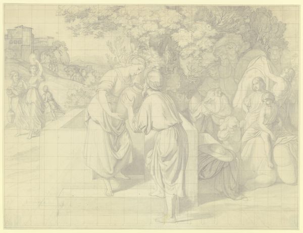 Curator: Peter Cornelius' "Scene in the Cathedral," rendered in ink on paper in 1811, depicts a congregation in quiet contemplation. Editor: The drawing is washed in pale hues, lending it a spectral, almost dreamlike quality. The figures appear caught in a moment of suspended animation. Curator: Cornelius was a key figure in the Nazarene movement. They sought to revive the spiritual depth of early Renaissance art within a religious context, often responding to the secular shifts happening within art institutions of the time. This work reflects their commitment to infusing art with morality and historical integrity. Editor: Looking at the composition, there is a very intentional organization of space and the characters occupying it. Notice the strategic use of architectural pillars to separate two groups on the right and the left, while also allowing their integration through the use of gothic arches and spatial harmony. The scene has both balance and visual interest, encouraging a very formal, close viewing experience. Curator: Indeed. These artists deliberately aimed for an art that served a public and pedagogical function, moving away from Baroque dynamism towards clarity. Cornelius sought to emulate the precision and clarity of early masters like Raphael and Dürer. Consider the impact that their artwork would have on social engagement as opposed to artworks whose subjects might not elicit the same communal feelings. Editor: One can certainly detect the meticulous detail—every figure is carefully delineated— yet there is a flatness. This deliberate flattening pushes the scene away from naturalism toward an emphasis on idealized form and symbolic clarity, and ultimately toward Cornelius' engagement with beauty as he understood it. Curator: The rediscovery of medieval art played a crucial role in shaping their artistic vision and ideology, responding against the grand narratives produced by art academies and seeking to create an alternative cultural space for spiritually guided art. Editor: For me, the composition holds an enduring beauty that encourages careful reflection on the details while being immersed in an idealized space. Curator: This drawing serves as a window into the artistic and socio-political aspirations of the Nazarene movement, revealing their engagement with history and morality.