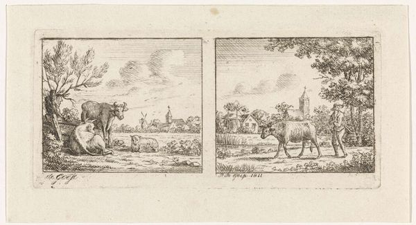 Editor: Here we have "Four Donkeys in a Landscape," created in 1583 by Marcus Gheeraerts the Elder. It’s an engraving currently housed at the Rijksmuseum. It’s hard to put my finger on it, but there is something about it that feels a bit… melancholic? What stands out to you? Curator: Melancholic... I see that. It's interesting how you pick up on that. Maybe it's the muted tones, or perhaps the donkeys themselves seem a little weary, wouldn’t you say? What fascinates me is the detailed rendering of the landscape. Gheeraerts, even with such humble subjects like donkeys, elevates the mundane. Does the backdrop speak to you in any way? Editor: The buildings in the back look impressive. They look as if people abandoned them... Perhaps the melancholia I mentioned? Curator: Absolutely! Now, look closer at the textures - the fur of the donkeys, the leaves on the trees, even the stonework in the distant city. The artist dedicated careful attention to each of those details. But don’t let that distract you from the humor. One of the donkeys is, well, very forward towards the other. It gives me pause - perhaps there is something comical about the relationships among the characters. And what about you? Editor: I suppose it can be viewed as an aspect, and also how carefully done it all is, from fur to stone! Before I had the impression it was made lightly. Curator: Precisely! And that is the charm, isn't it? Works from this period aren't necessarily what they appear to be on the surface. We must allow ourselves to ponder. Editor: It’s definitely given me a fresh appreciation. Now I see details, layers even. Curator: Wonderful. It seems we’ve both taken something special away from these donkeys. I find this really enchanting.